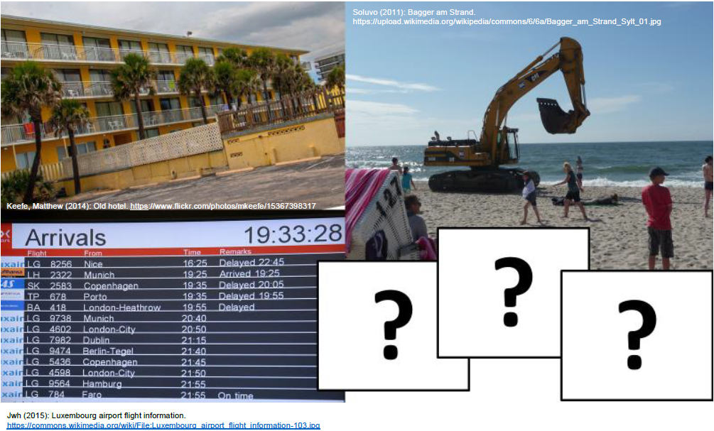 Familie Schumann war auf Urlaub und hat einen Horrortrip erlebt. Arbeitet in Zweierteams und notiert anhand der Fotos drei Probleme, die es im Urlaub gab (ein Kärtchen pro Problem). Es gab noch drei weitere Probleme, die nicht fotografiert wurden. Benennt die Probleme und haltet die Ergebnisse auf drei weiteren Kärtchen fest.